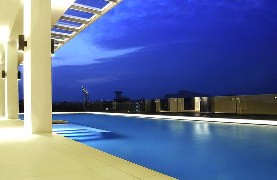 The fourth floor of the building has a large pool terrace, paved with imported limestone, and a 25 metre ozone treated open air swimming pool with views across the city. On the same floor there is a large fully equipped gym and a furnished library and meeting room.